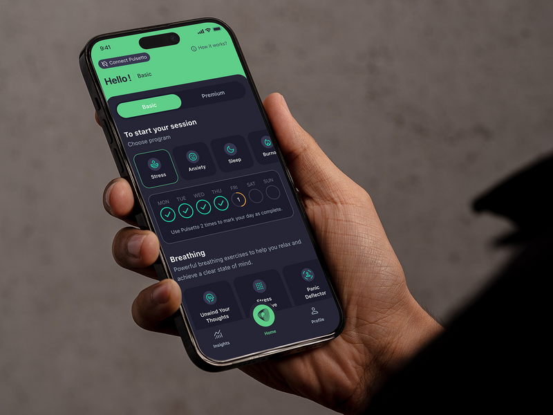 Open the Pulsetto app, select your preferred program - Stress, Sleep, Burnout, or Pain - and get ready to unwind.