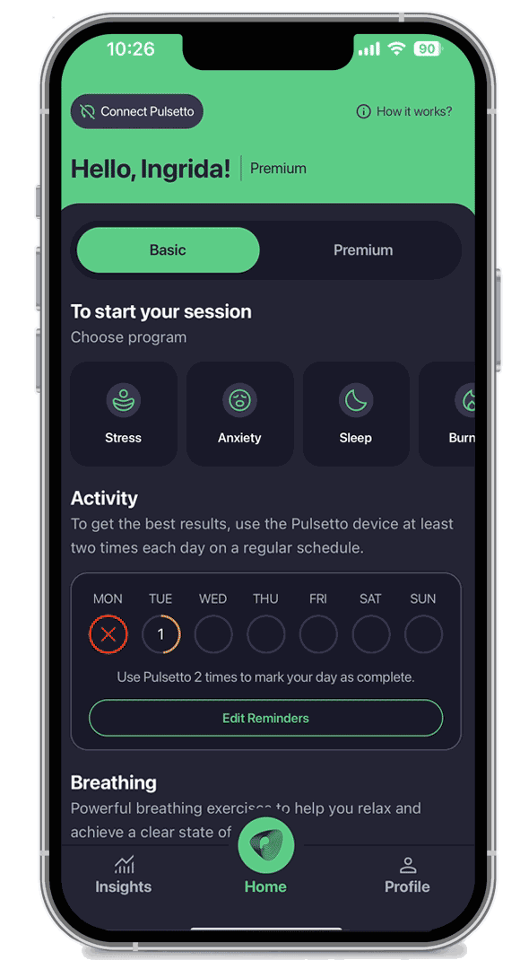 Free lifetime Pulsetto App with 5 expert-designed programs for Stress, Anxiety, and More.