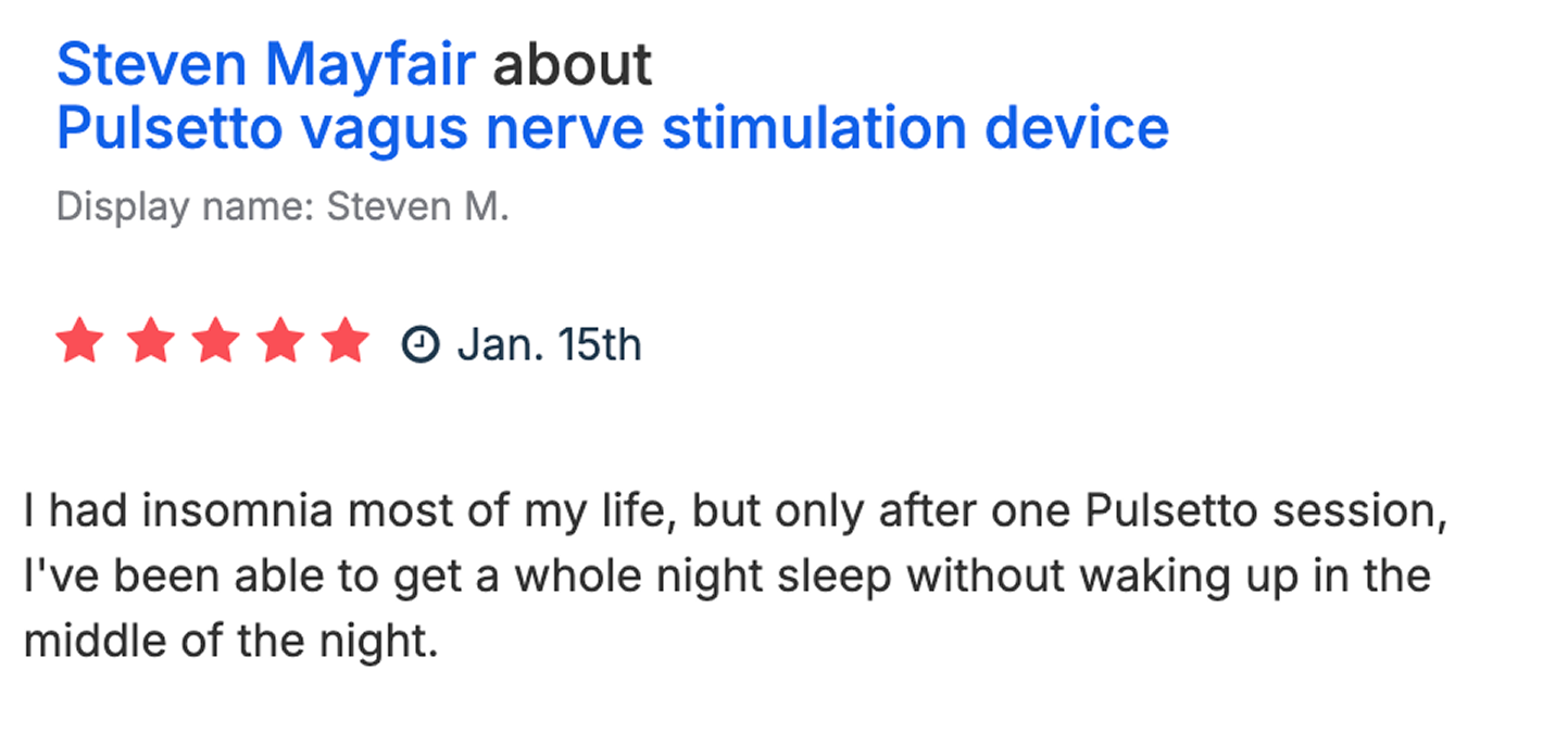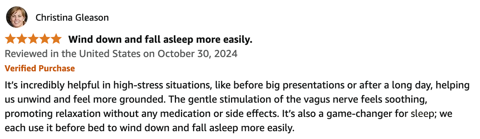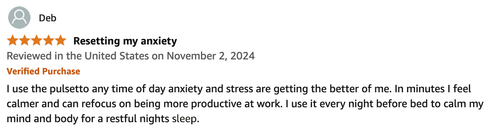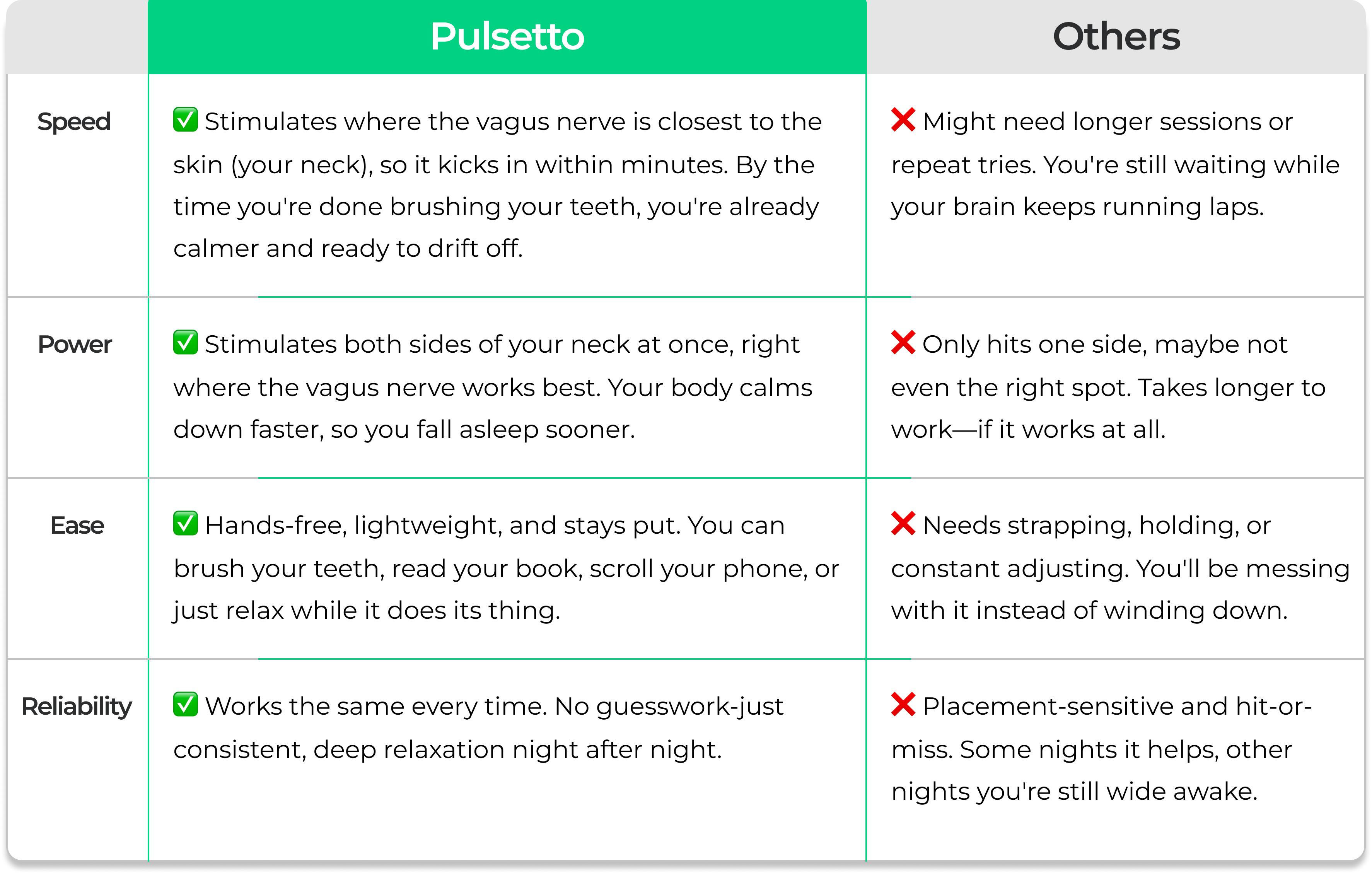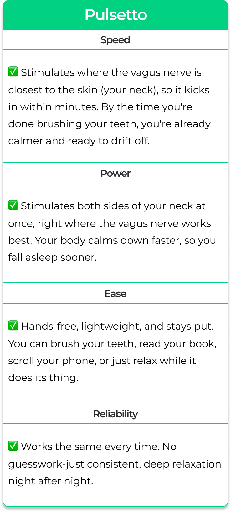 Pulsetto gently stimulates your vagus nerve—the part of your body that controls stress, sleep, and relaxation. Just wear it for a few minutes, and it helps your body shift into a calmer state.